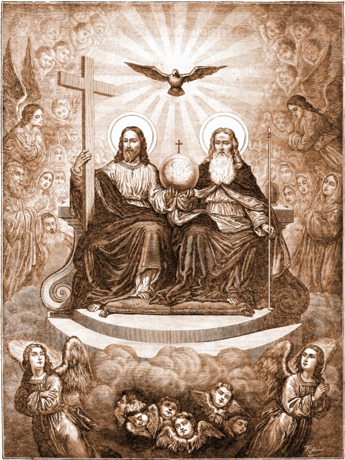 10. Deze prent stelt ons Jezus Christus voor zoals Hij in de hemel op een troon van glorie zit aan de rechterhand van zijn Vader. Engelen en heiligen omgeven Hem en zijn troon wordt gedragen door talloze hemelse geesten. De Vader houdt de koningsstaf in de hand en de Zoon het kruis. Beiden ondersteunen ze het aardrijk, dat de Vader schiep, dat de Zoon verloste en dat de Heilige Geest heiligde.
